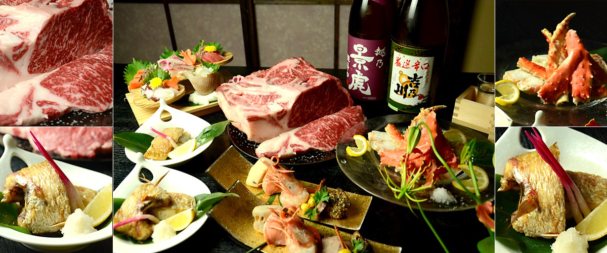 長岡では朔だけにしかない料理=「県産熟成サーロイン」などを含む計8品。